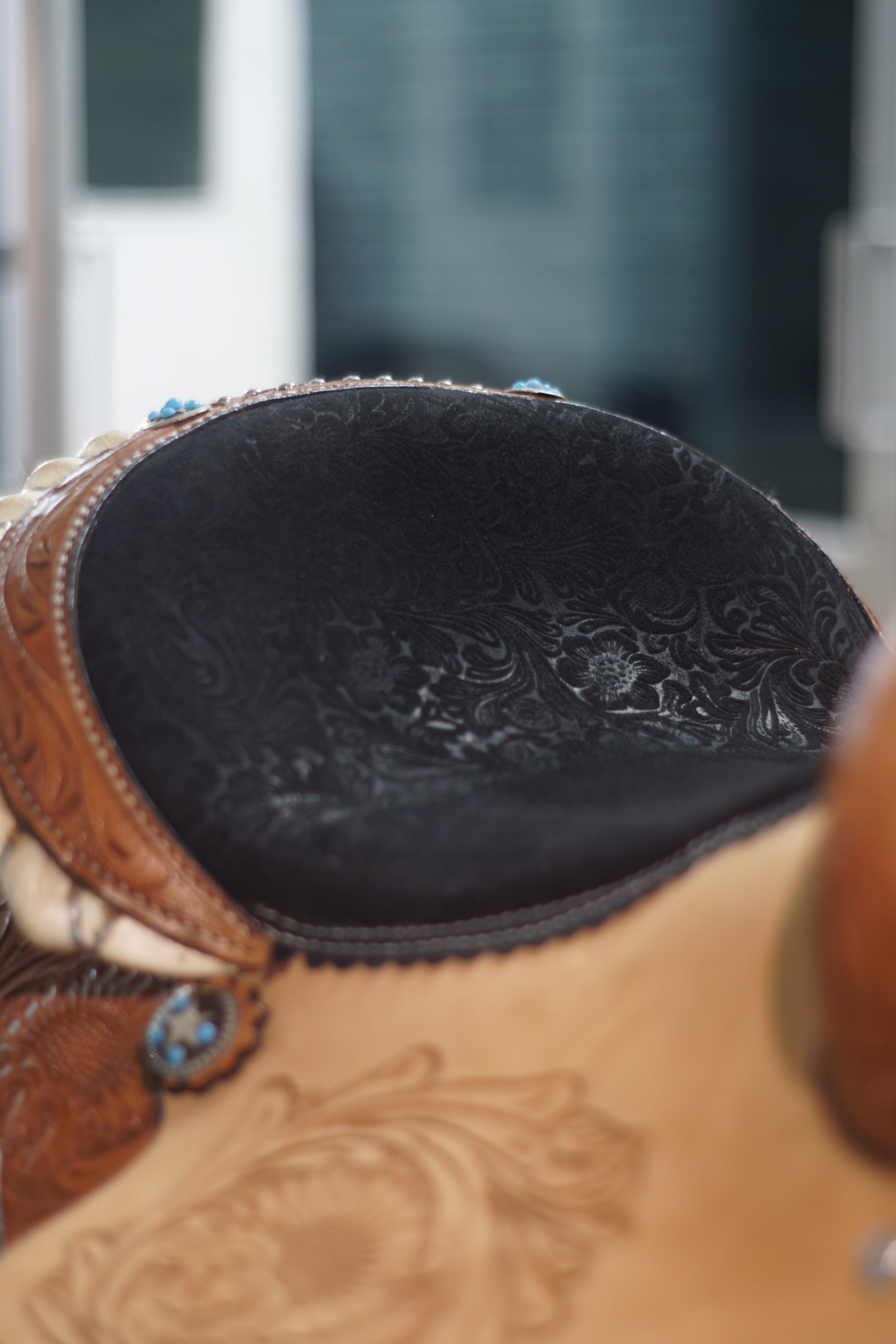 This saddles features a hand carved floral tooling that is accented with a roughout leather on the jockey flaps and fenders. The conchos make this saddle stand out and bling in the show ring. The seat is well-padded black suede for comfort and extra grip while riding. The underside is a well padded fleece for your horse’s comfort. For a limited time only, receive a matching headstall, reins, and breast collar while supplies last!