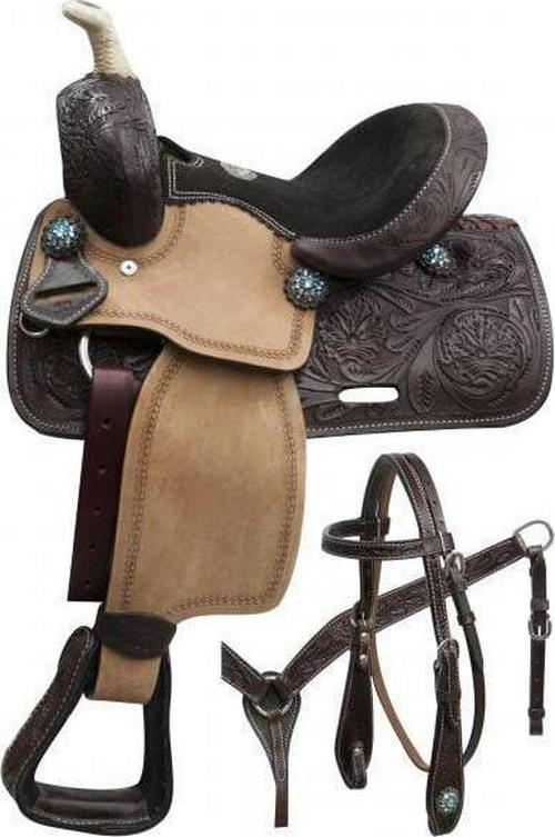 10″ pony saddle set with blue crystal rhinestones. This saddle features dark oil floral tooled skirts, pommel and cantle with rough out fenders and jockeys that are accented with a tooled border. Saddle comes equipped with leather latigo and off billet. Headstall and breast collar are accented with dark oil floral tooling and headstall features blue crystal rhinestone rosette conchos. Model: 7865Seat: 10″ Suede LeatherBars: *Semi Quarter horseSwell: 10″Gullet: 5″Horn: 2.5″ Rawhide BraidedCantle: 3.5″Skirts: 9″ x 18″Stirrup Adjustment: 21″ to 26″