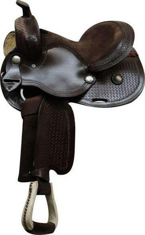 12″ Economy western saddle with basket weave tooling and silver conchos.Model: 326712Seat: 12″ Suede Leather