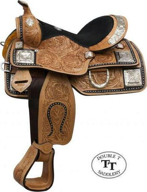 13″ fully tooled Youth / Pony show saddle with silver. This youth/ pony saddle features fully tooled medium oil leather accented with engraved silver square plating front and back of skirts and silver plates on pommel and cantle. Black inlay design on pommel, skirts and fenders are accented with silver studs. Saddle comes equipped with front D rings, leather latigo and off billet.Model# 965713Seat: 13″ Black Suede
