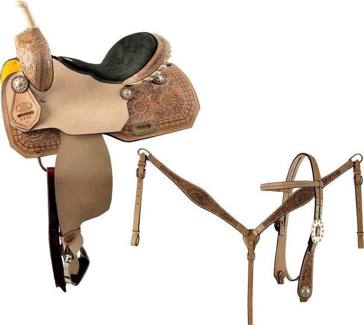 4″, 15″, 16″ Barrel saddle set with Sunflower tooling and matching Bridle & BC Set. This saddle features light oil Rough Out Fenders and jockeys, the skirts, pommel and cantle all feature the sunflower tooling design. Black suede seat is accented with a rawhide/ silver braiding and braided rawhide horn. Saddle comes equipped with front D rings, leather latigo and off billet.