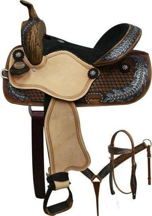 14″, 15″ barrel style saddle with oak leaf tooled design. This saddle features a stamped basket weave tooled design with metallic painted oak leaf design with silver studs. Rough out fenders and jockeys and a black suede leather seat. Saddle is equipped with front D rings, leather latigo and off billet and black steel stirrups.