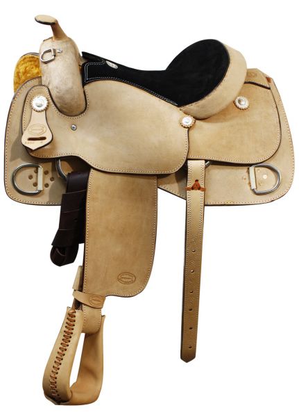 full rough out leather training saddle with suede seat. This saddle comes equipped with D rings on skirts and pommel to help attach training aids. Saddle is accented with small silver conchos.