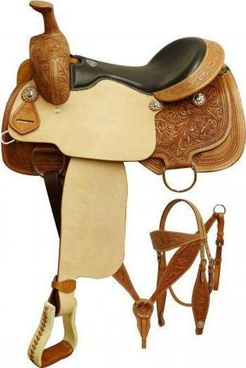16″ Roper style saddle set with floral tooling. This saddle features floral tooling on skirts, pommel and cantle. Rough out fenders and jockeys with a black top grain leather seat. Saddle comes equipped with front D rings, leather latigo and off billet and a dropped back rigging.Matching headstall features floral tooling and comes with 5/8″ x 7′ leather split reins.Model:5163Seat: 16″Gullet: 7.5″