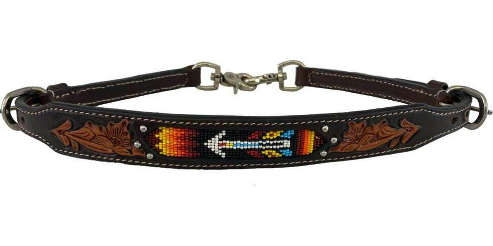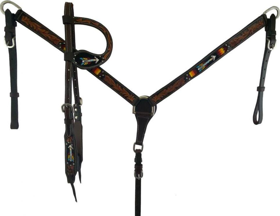 Beaded Arrow design 4 Piece Argentina Leather Headstall and Breastcollar Set with Matching Whither Strap & Spur Straps. This set features Dark Argentina Cow leather with a beaded arrow design in black, yellow, and red beads. Set is accented with silver beads and buckles and a floral lighter tooling. Set comes with single ear headstall, breastcollar, wither strap, and spur straps. Hardware is Stainless Steel.
