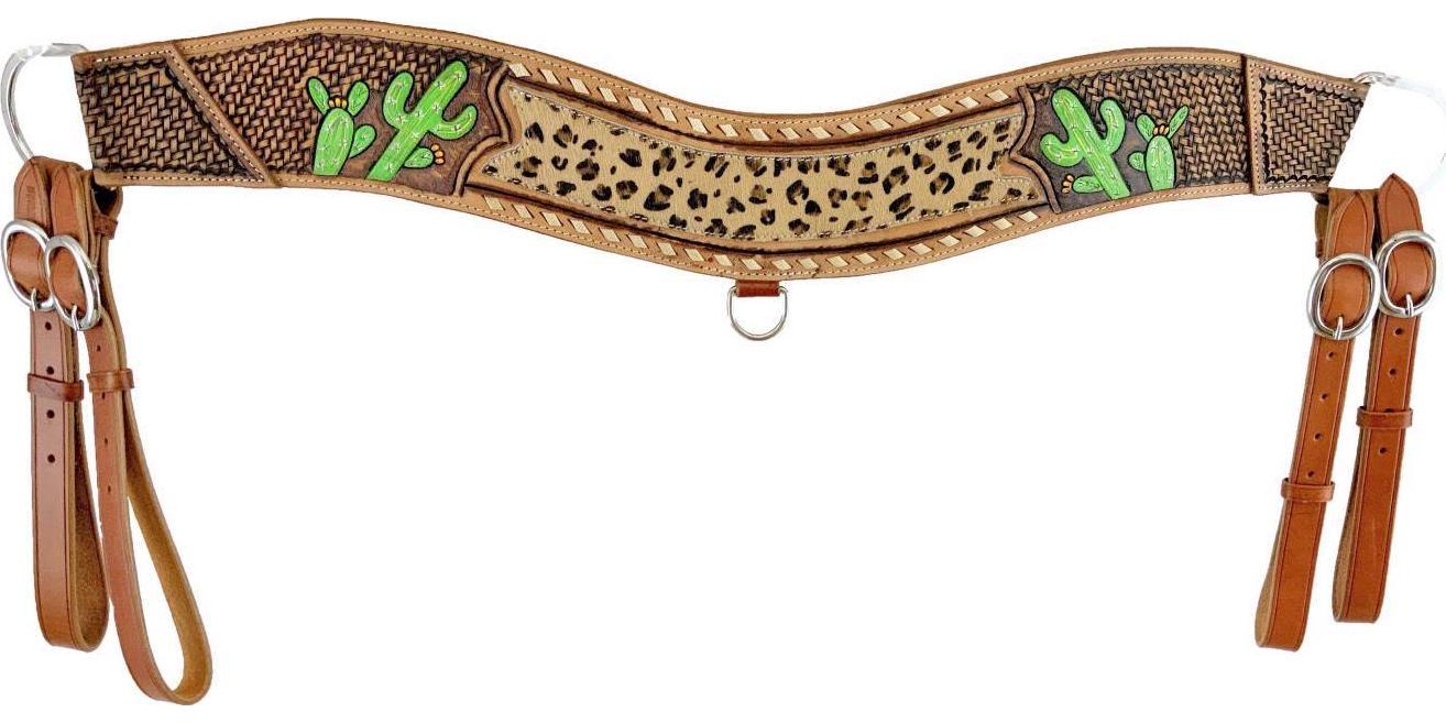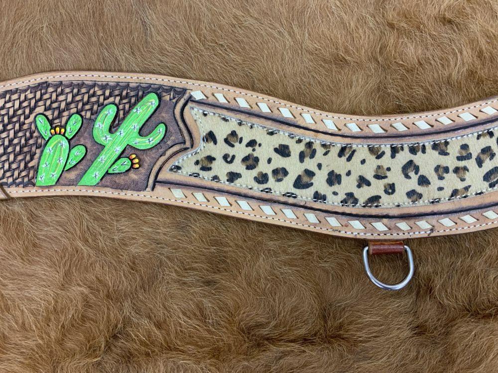 Hand Painted Cactus tripping collar with Hair on Cheetah Inlay. This tripping collar features medium leather with hand painted cactus, cheetah hair on inlay and rawhide lacing. Features stainless steel hardware and is approx. 4″ wide.