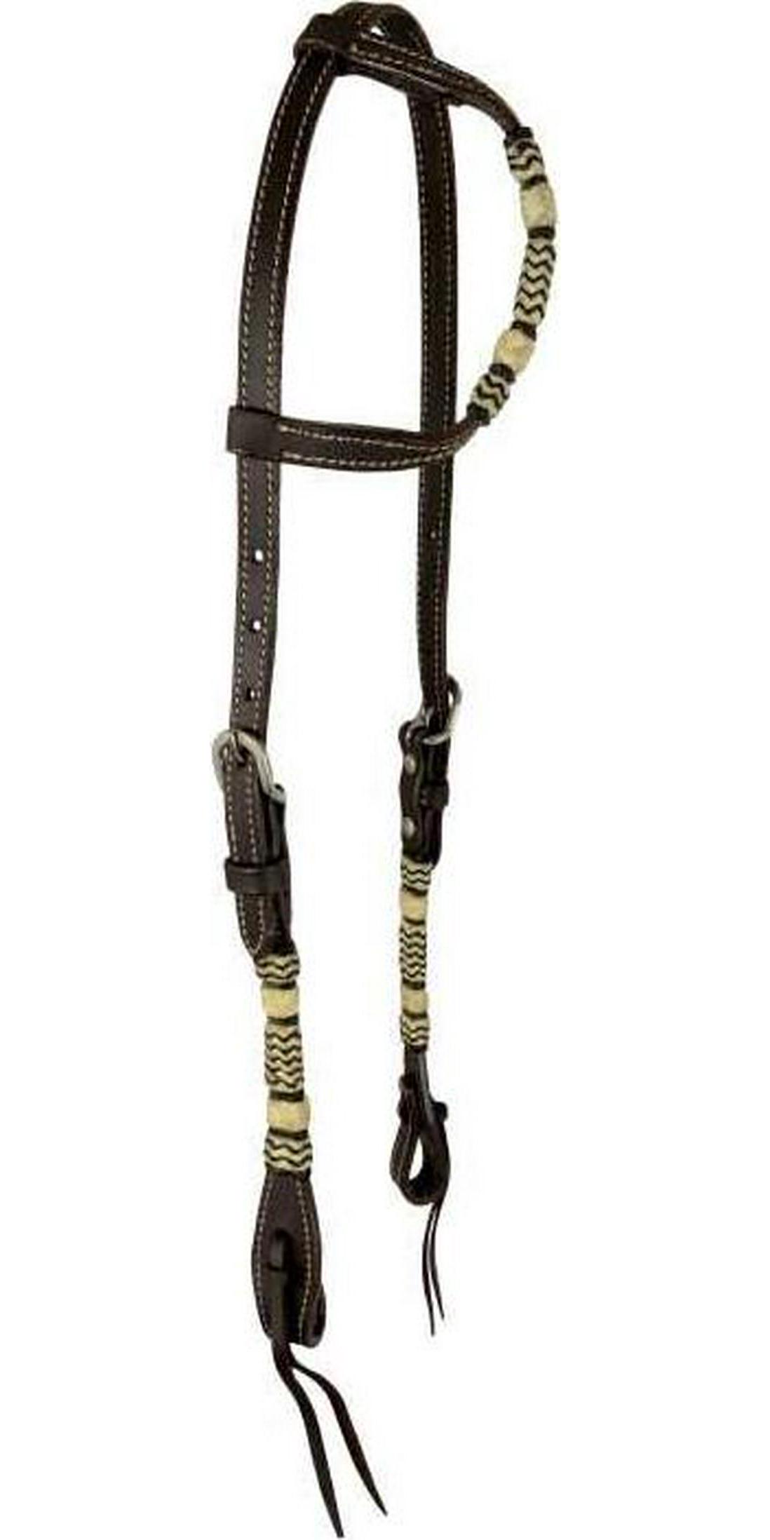 One Ear Headstall with Rawhide Accents. This Dark Oil Headstall features natural rawhide braiding and white stitching accents. REINS NOT INCLUDED