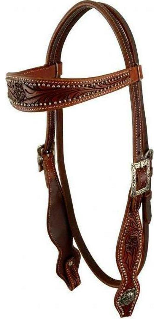 Argentina burgundy cow leather with floral tooling and silver dots. This headstall features burgundy colored Argentina cow leather and is accented with floral tooling on the cheeks and browband with a silver beading and antique silver concho. Headstall has nickel hardware and features cowboy knot ties for quick change of the bit. REINS NOT INCLUDED. Hardware is Stainless Steel.