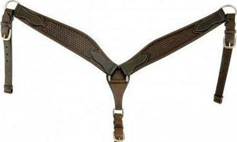 Argentina cow leather basket tooled breastcollar. This breast collar features a Dark Oil Argentina cow leather tooled leather contoured design with basket tooling and 3/4″ leather tugs. Measures approx. 3 1/2″ wide at widest point. Hardware is Stainless Steel.