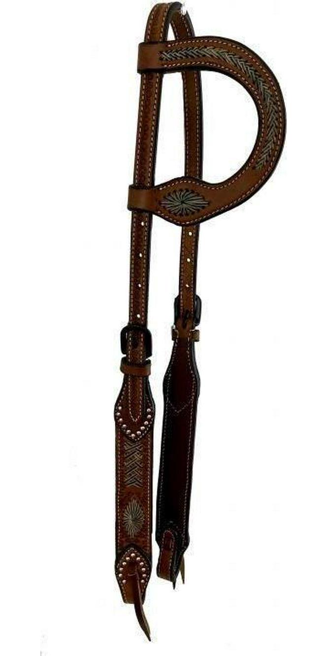 Argentina cow leather single ear headstall with rawhide inlay design. This headstall features medium colored Argentina cow leather with rawhide on ear piece and cheeks. Reins not included. Hardware is Stainless Steel.