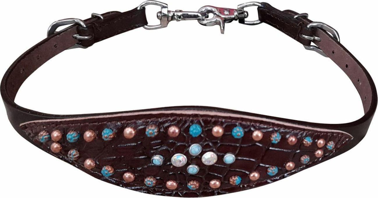 Dark brown gator wither strap turquoise and copper beading. This wither strap features dark oil leather with brown gator overlay with copper and turquoise beading. Easily adjusts with 2 buckles 23″-30″