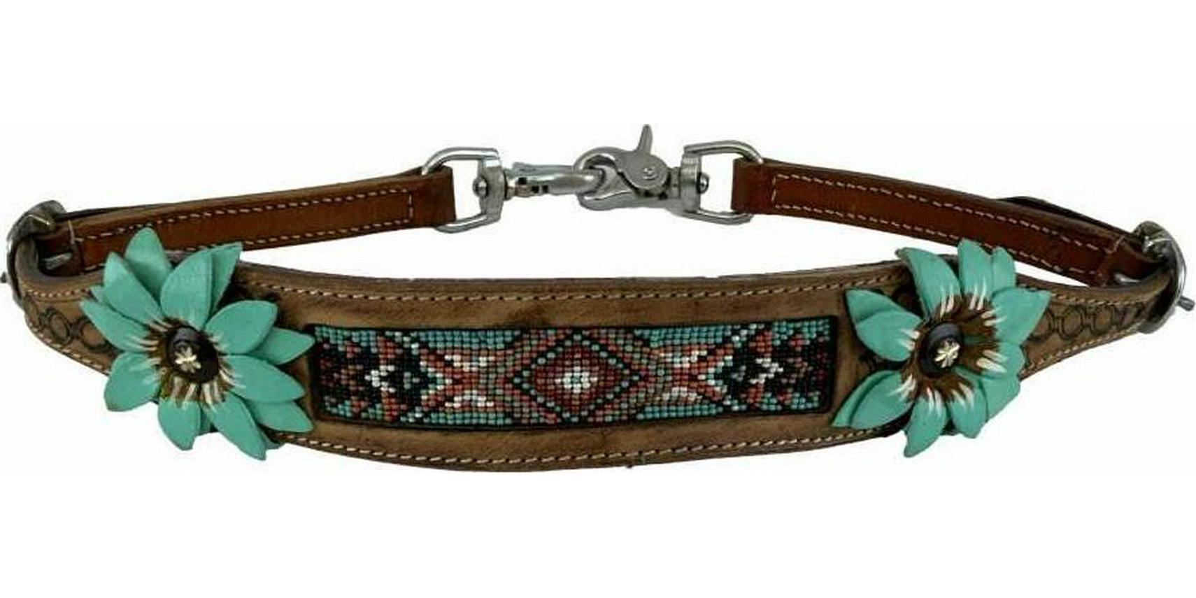 Hand painted 3D flower wither strap with beaded center. This wither strap features medium leather with hand painted 3D teal flower, and multi  color beaded center . Includes stainless steel hardware.