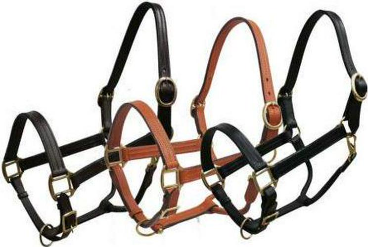Horse size leather halter with brass hardware. Accented with three rows of stitching. Has adjustable nose, double buckle crown and throat latch.Thanks for looking at our items!