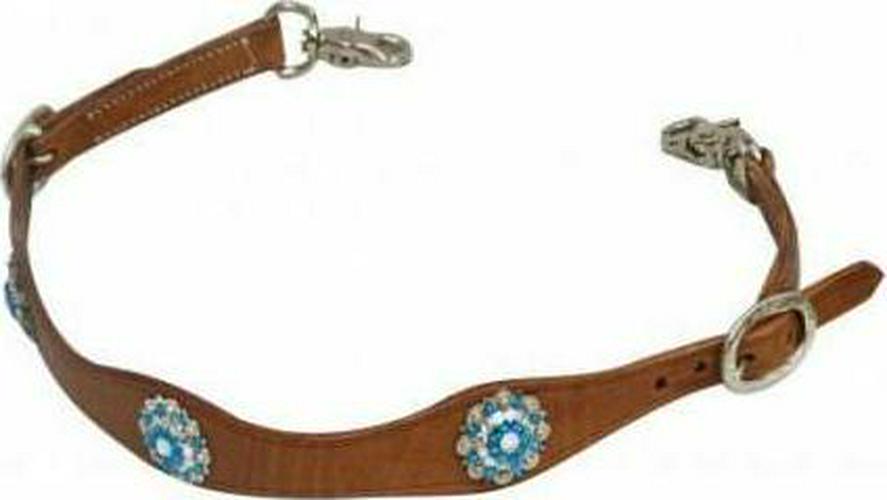 1.25″ wide leather wither strap with crystal studs. Easily attach to breast collar rings with scissor snaps on both ends and adjusts with engraved buckles 27″ – 29.5″.Thanks for looking at our items!