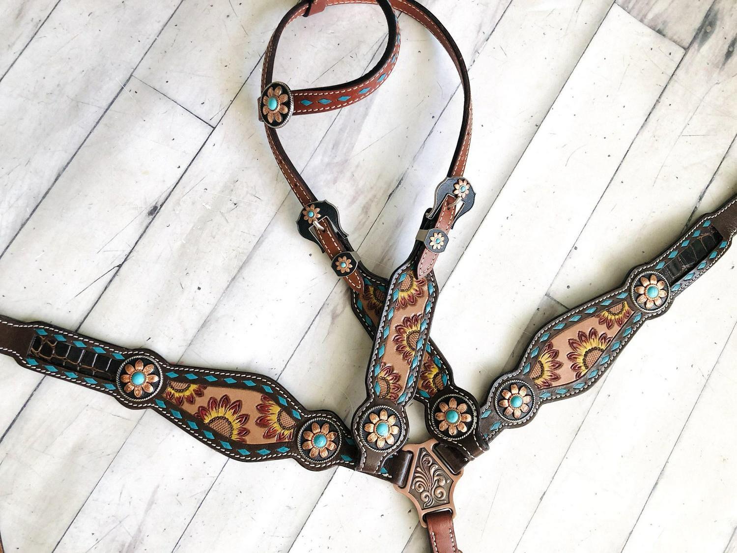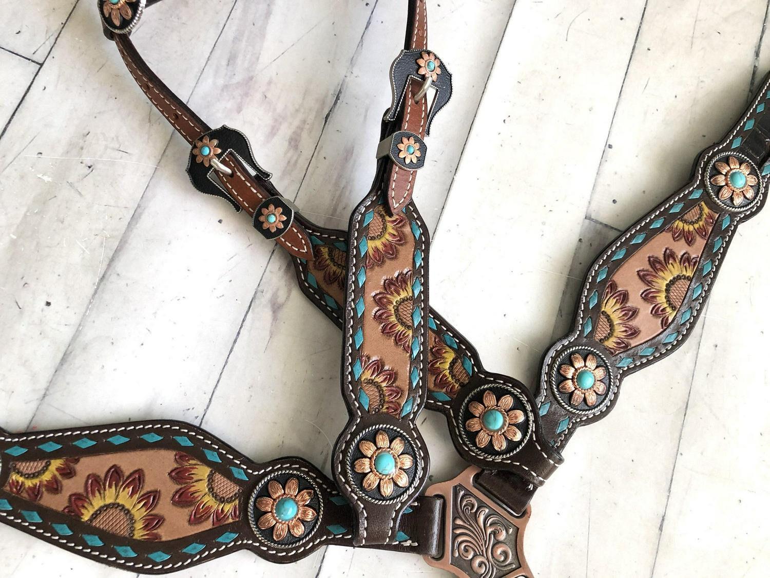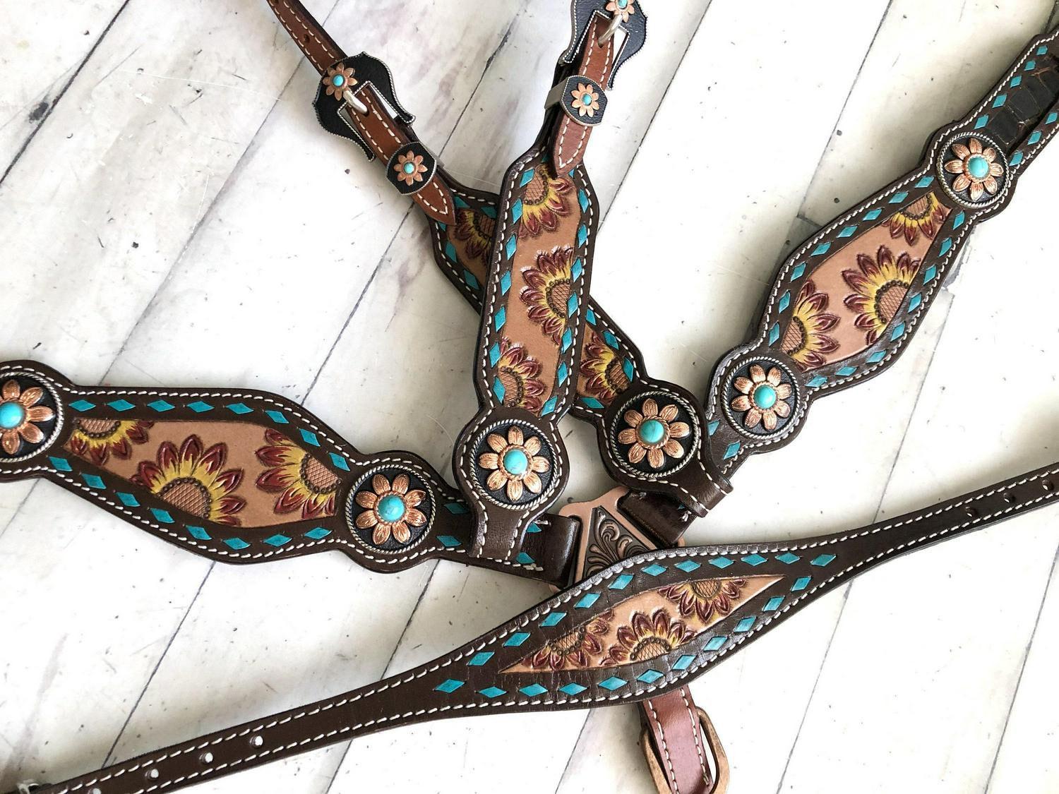 Sale 20% Off Sunflower Tooling – Hand Painted – Teal Buckstitch 6 Piece Horse Tack Set