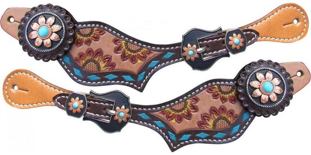 7′ leather split reins. 3 Piece Horse Tack Set – Hand Painted Sunflower Leather One Ear headstall, breastcollar, reins set. This set features a dark brown leather overlay on medium leather, hand painted red and yellow sunflower inlay and a brown alligator inlay on breastcollar. Headstall and breastcollar are accented with turquoise buckstitch trim. Set is accented with black and copper flower conchos and buckles with turquoise stones. Bronc Halter- Adjustable nylon bronc halter with hand painted sunflower noseband. This halter features a wide scalloped bronc style noseband with three hand painted red and yellow sunflowers with a brown background and turquoise buckstitch trim. Noseband is accented with copper flower conchos with turquoise stone center. Black nylon halter with nickel plated hardware and eyelets.Spur Straps – Hand Painted Sunflower Spur Straps with turquoise buckstitch. These spur straps feature medium leather with a dark brown overlay and light brown inlay. Spur straps are hand painted with red and yellow sunflowers and turquoise buckstitch trim. Accented with black and copper flower engraved buckles and conchos with turquoise stones.Includes Matching Headstall, Breastcollar, Reins + Wither Strap + Bronc Halter + Spur Straps~~We Ship Worldwide~~Thanks for looking at our items!
