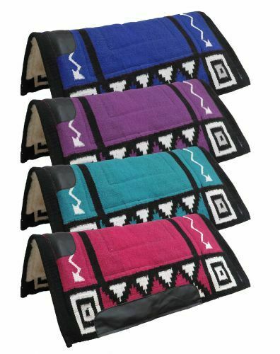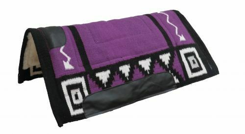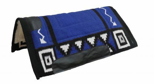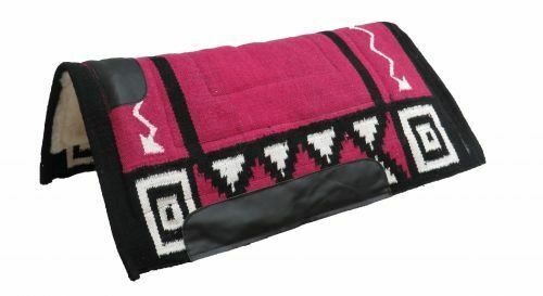 36″ x 34″ Cutter Style Woven Wool Saddle Pad w/ Navajo Design. This cutter style saddle pad features a woven wool top with Navajo design, Kodel fleece bottom and oversized top grain wear leathers.