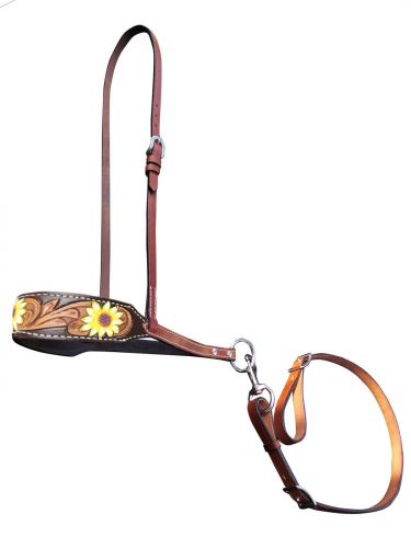 ® Hand Painted Sunflower leather tie down noseband and strap. Noseband features dark brown leather with a medium colored tooled overlay and three hand painted yellow sunflowers. Noseband comes with 3/4″x 42″ medium leather tiedown with nickel plated snap.