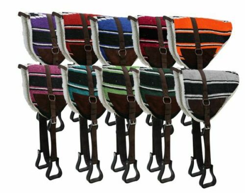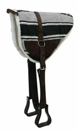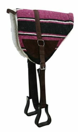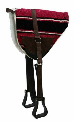 Navajo print bareback saddle pad with Kodel fleece bottom and suede wear leathers. Comes equipped with english style girth and molded plastic western style stirrups. Features a nylon grab handle at the front.