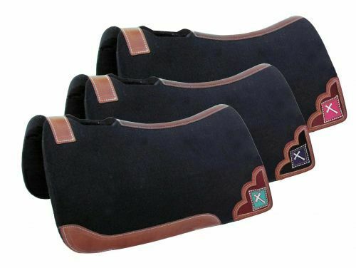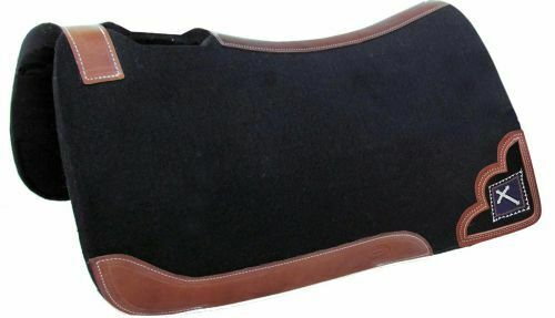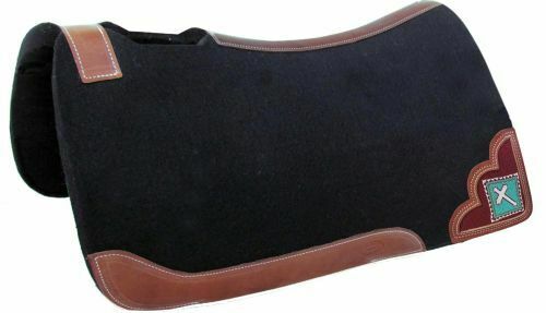32″ X 31″ x 1″ felt pad with beaded cross inlay. This pad features 1″ thick black, heavy duty blended felt with a vented wither and a leather reinforced spine that is contoured to fit the horse. MPN 22935