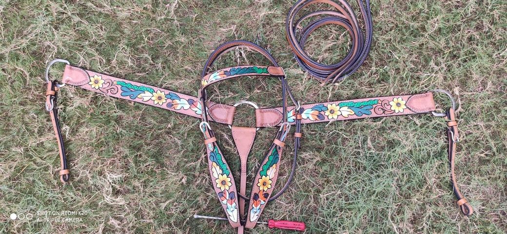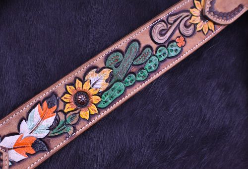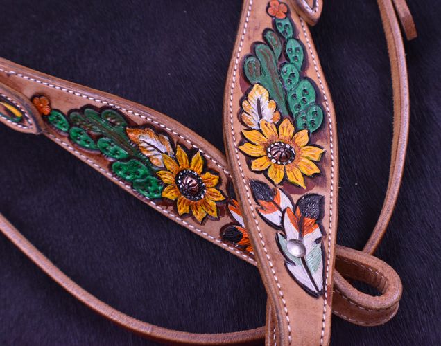 • Headstall and breastcollar feature hand painted sunflowers, cactus, and feather.
